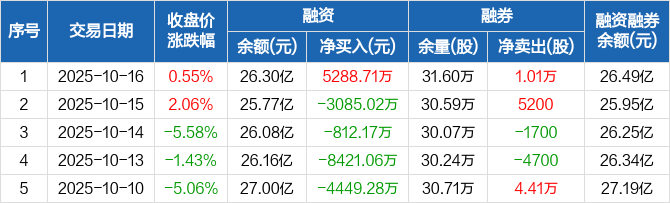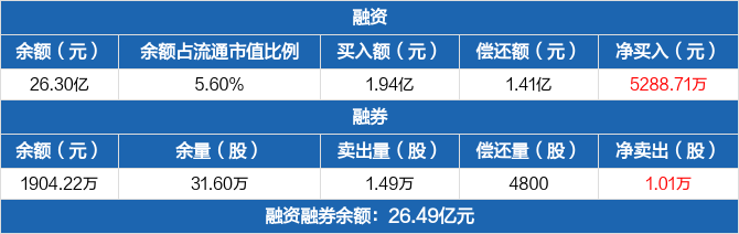融资方面,当日融资买入1.94亿元,融资偿还1.41亿元,融资净买入5288.71万元。融券方面,融券卖出1.49万股,融券偿还4800股,融券余量31.6万股,融券余额1904.22万元。融资融券余额合计26.49亿元。