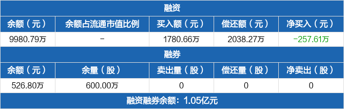 融资方面,当日融资买入1780.66万元,融资偿还2038.27万元,融资净偿还257.61万元。融券方面,融券卖出0份,融券偿还0份,融券余量600万份,融券余额526.8万元。融资融券余额合计1.05亿元。