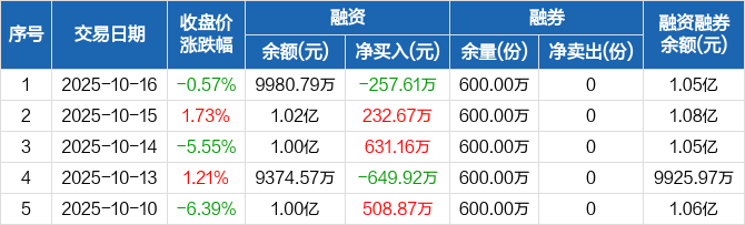 芯片ETF龙头融资融券信息显示,2025年10月16日融资净偿还257.61万元;融资余额9980.79万元,较前一日下降2.52%