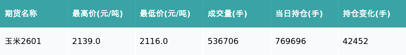 南财智讯10月17日电,南财金融终端盘后期货数据显示,大连商品交易所的玉米主力合约收跌0.66%,收盘报2117.0元/吨,日内资金流入1.06亿元。其他相关指标见下表: