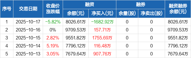 融资方面,当日融资买入1516.49万元,融资偿还3199.41万元,融资净偿还1682.92万元,净偿还额创12个月新高。融券方面,融券卖出0股,融券偿还0股,融券余量0股,融券余额0元。融资融券余额合计8026.61万元。