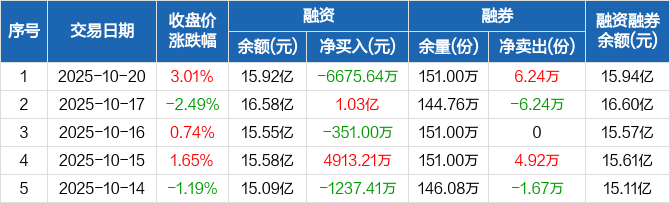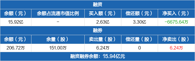 融资方面,当日融资买入2.63亿元,融资偿还3.3亿元,融资净偿还6675.64万元。融券方面,融券卖出6.24万份,融券偿还0份,融券余量151万份,融券余额206.72万元。融资融券余额合计15.94亿元。