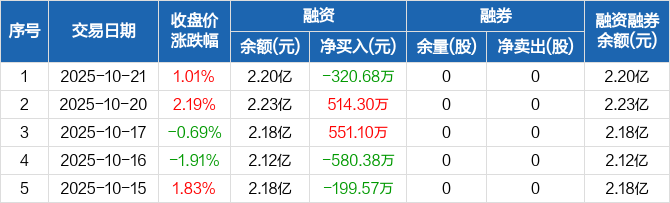 融资方面,当日融资买入1155.05万元,融资偿还1475.73万元,融资净偿还320.68万元。融券方面,融券卖出0股,融券偿还0股,融券余量0股,融券余额0元。融资融券余额合计2.2亿元。
