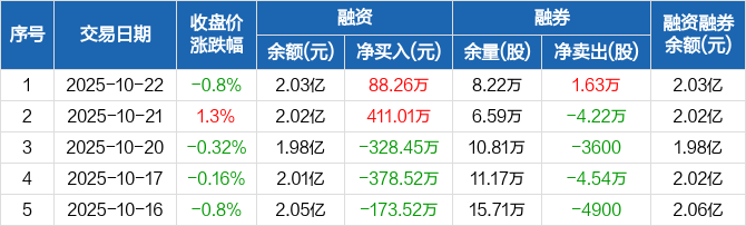 融资方面,当日融资买入911.94万元,融资偿还823.69万元,融资净买入88.26万元。融券方面,融券卖出1.76万股,融券偿还1300股,融券余量8.22万股,融券余额50.88万元。融资融券余额合计2.03亿元。