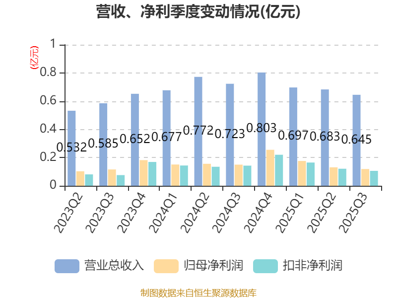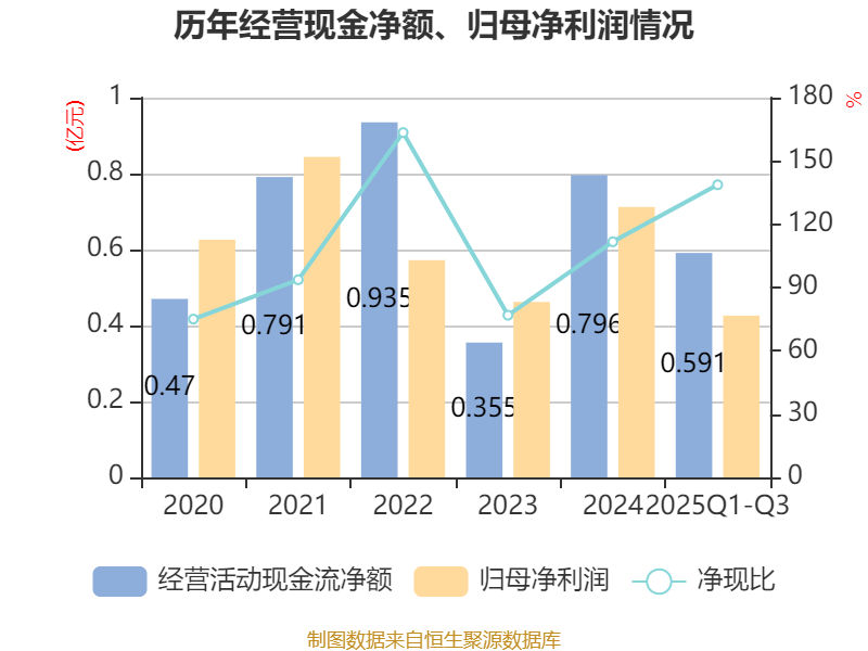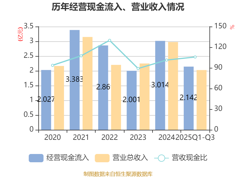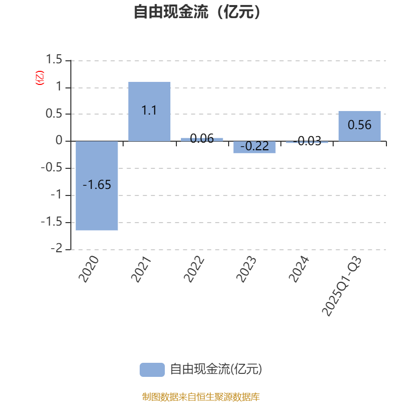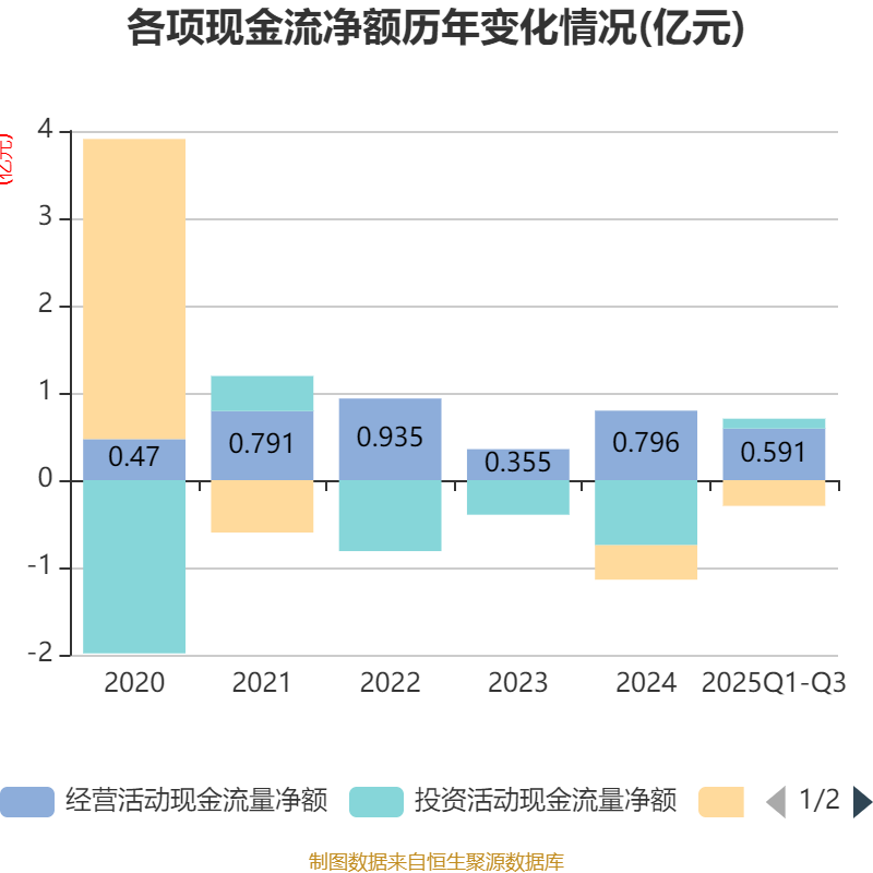 2025年前三季度,公司经营活动现金流净额为5909.39万元,同比下降12.74%;筹资活动现金流净额-2952.25万元,同比增加446.05万元;投资活动现金流净额1129.68万元,上年同期为-1030.95万元。