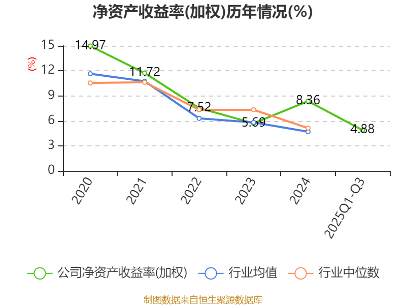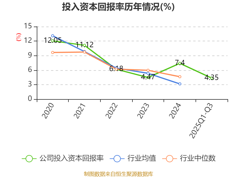 盈利能力方面, 2025年前三季度公司加权平均净资产收益率为4.88%,同比下降0.56个百分点。公司2025年前三季度投入资本回报率为4.35%,较上年同期下降0.35个百分点。