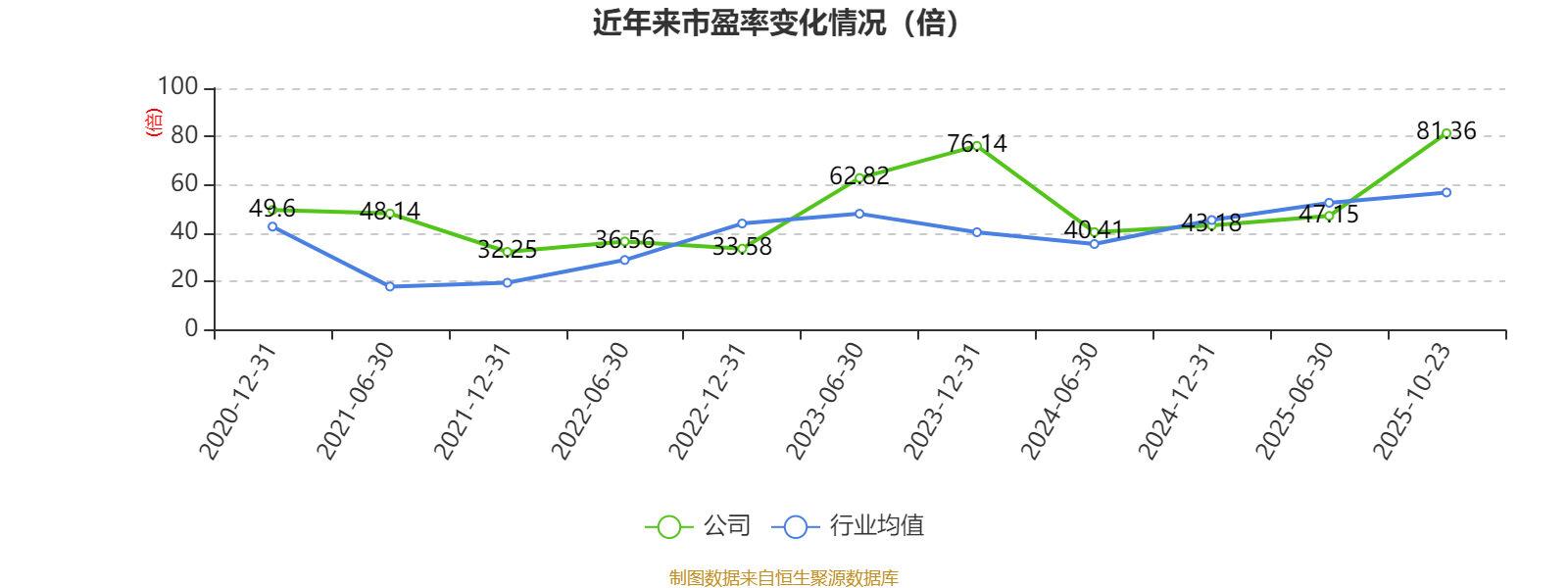 以10月23日收盘价计算,海昌新材目前市盈率(TTM)约为81.36倍,市净率(LF)约6.3倍,市销率(TTM)约19.59倍。