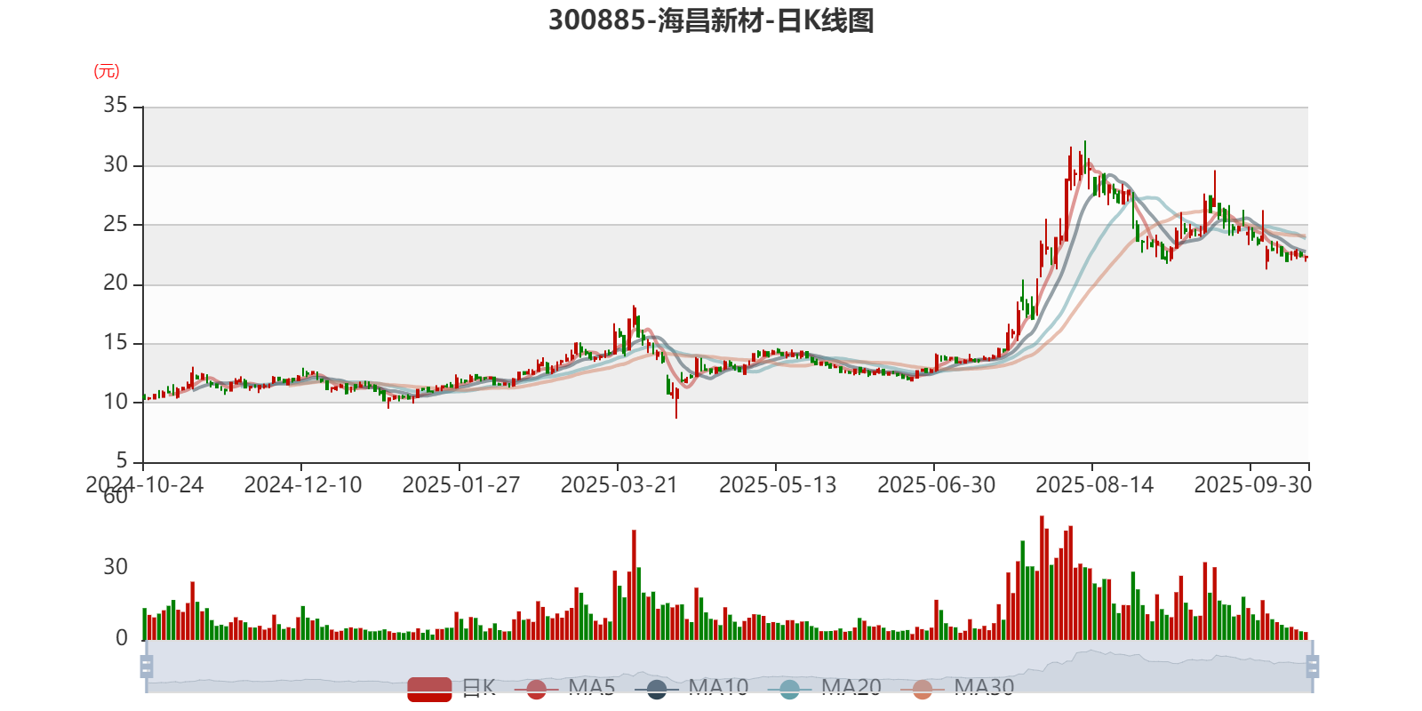 中证智能财讯海昌新材(300885)10月24日披露2025年第三季度报告。前三季度公司实现营业总收入2.03亿元,同比下降6.74%;归母净利润4260.68万元,同比下降6.82%;扣非净利润3914.43万元,同比下降7.23%;经营活动产生的现金流量净额为5909.39万元,同比下降12.74%;报告期内,海昌新材基本每股收益为0.1717元,加权平均净资产收益率为4.88%。