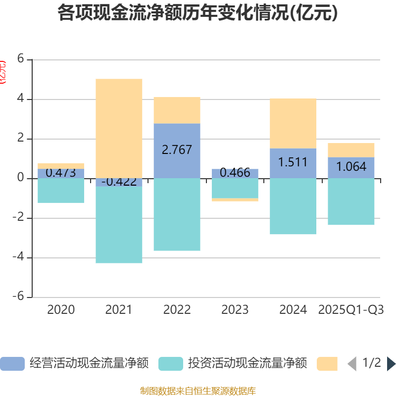 2025年前三季度,公司经营活动现金流净额为1.06亿元,同比下降51.83%;筹资活动现金流净额7115.26万元,同比增加1053.75万元;投资活动现金流净额-2.36亿元,上年同期为-1.16亿元。