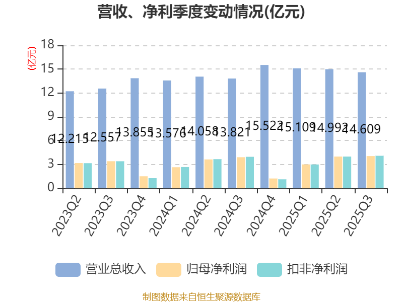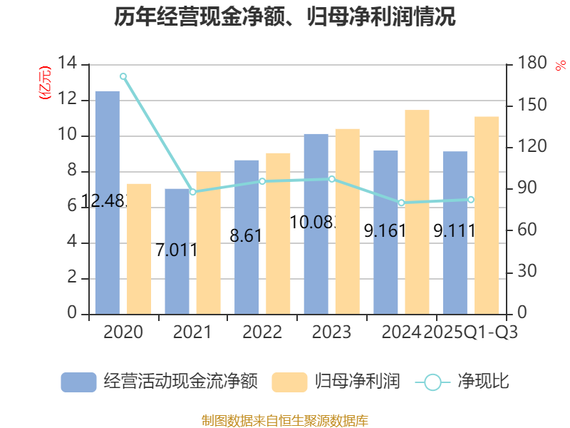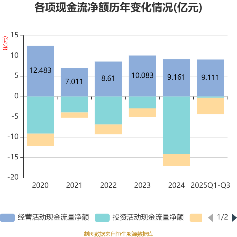 2025年前三季度,公司经营活动现金流净额为9.11亿元,同比下降0.01%;筹资活动现金流净额-4.1亿元,同比减少1.44亿元;投资活动现金流净额-2956.33万元,上年同期为-12.07亿元。