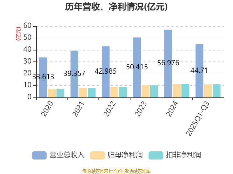 中证智能财讯恩华药业(002262)10月25日披露2025年第三季度报告。前三季度公司实现营业总收入44.71亿元,同比增长7.85%;归母净利润11.06亿元,同比增长8.42%;扣非净利润11.09亿元,同比增长7.59%;经营活动产生的现金流量净额为9.11亿元,同比下降0.01%;报告期内,恩华药业基本每股收益为1.09元,加权平均净资产收益率为14.31%。