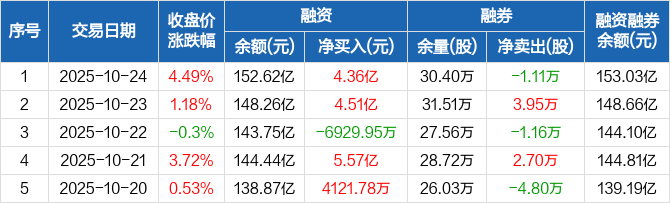 中芯国际融资融券信息显示,2025年10月24日融资净买入4.36亿元;融资余额152.62亿元,较前一日增加2.94%。