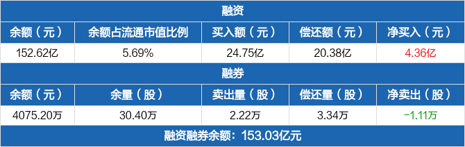 融资方面,当日融资买入24.75亿元,融资偿还20.38亿元,融资净买入4.36亿元,净买入额两市排名第七。融券方面,融券卖出2.22万股,融券偿还3.34万股,融券余量30.4万股,融券余额4075.2万元。融资融券余额合计153.03亿元。