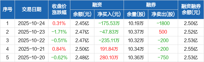 融资方面,当日融资买入761.12万元,融资偿还936.65万元,融资净偿还175.53万元,连续3日净偿还累计458.46万元。融券方面,融券卖出0股,融券偿还1800股,融券余量10.19万股,融券余额529.72万元。融资融券余额合计2.5亿元。