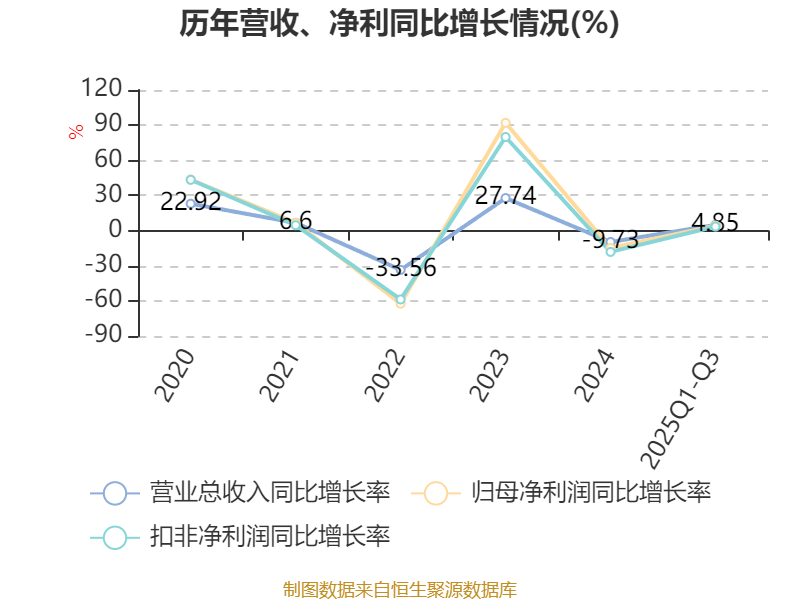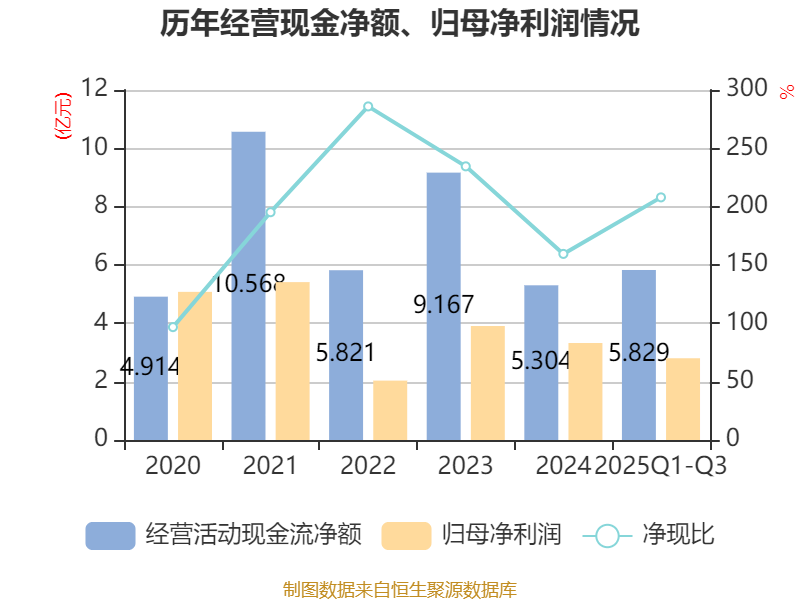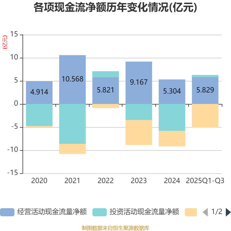2025年前三季度,公司经营活动现金流净额为5.83亿元,同比增长13.42%;筹资活动现金流净额-5.15亿元,同比减少6.32亿元;投资活动现金流净额4475.43万元,上年同期为-7.7亿元。