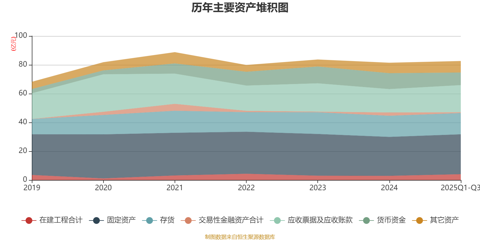 资产重大变化方面,截至2025年三季度末,公司货币资金较上年末减少20.9%,占公司总资产比重下降2.99个百分点;应收票据及应收账款较上年末增加16.06%,占公司总资产比重上升2.88个百分点;交易性金融资产合计较上年末减少75.78%,占公司总资产比重下降2.15个百分点;在建工程合计较上年末增加39.23%,占公司总资产比重上升1.32个百分点。