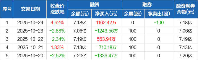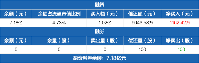 融资方面,当日融资买入1.02亿元,融资偿还9043.58万元,融资净买入1162.42万元。融券方面,融券卖出0股,融券偿还100股,融券余量0股,融券余额0元。融资融券余额合计7.18亿元。