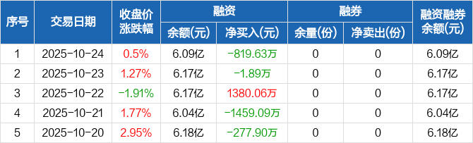 融资方面,当日融资买入5678.5万元,融资偿还6498.14万元,融资净偿还819.63万元。融券方面,融券卖出0份,融券偿还0份,融券余量0份,融券余额0元。融资融券余额合计6.09亿元。
