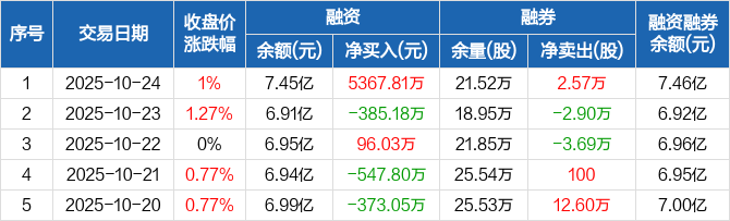 融资方面,当日融资买入1.13亿元,融资偿还5933.39万元,融资净买入5367.81万元,净买入额创12个月新高。融券方面,融券卖出3.56万股,融券偿还9900股,融券余量21.52万股,融券余额86.94万元。融资融券余额合计7.46亿元。