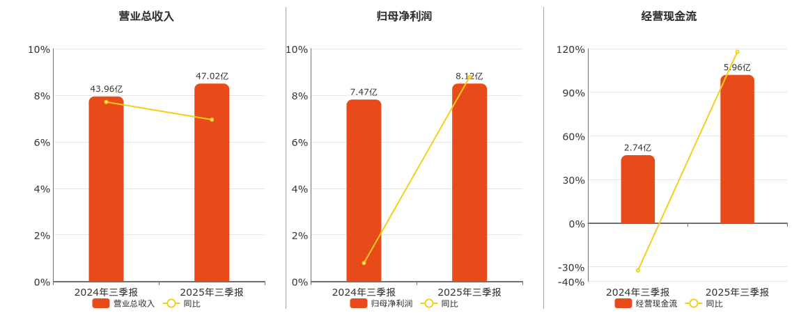 公司营业总收入为47.02亿元。归母净利润为8.12亿元。经营活动现金净流入为5.96亿元。