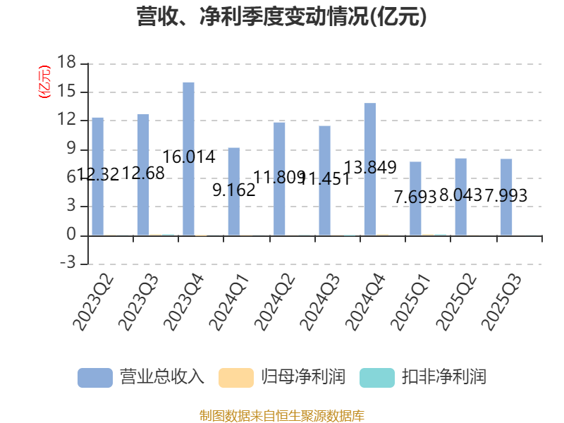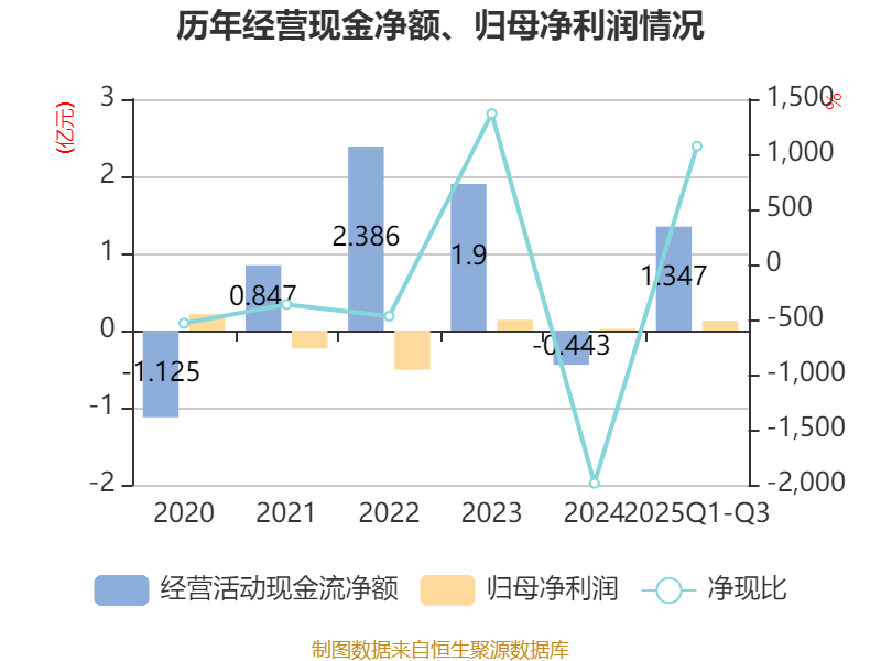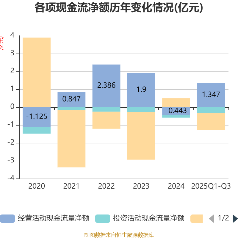2025年前三季度,公司经营活动现金流净额为1.35亿元,同比增加1.67亿元;筹资活动现金流净额-9405.55万元,同比减少2.24亿元;投资活动现金流净额-3410.26万元,上年同期为-887.86万元。
