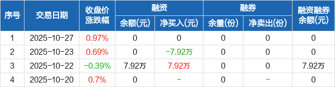 融资方面,当日融资买入61.79万元,融资偿还61.79万元,融资净买入0元。融券方面,融券卖出0份,融券偿还0份,融券余量0份,融券余额0元。融资融券余额合计0元。