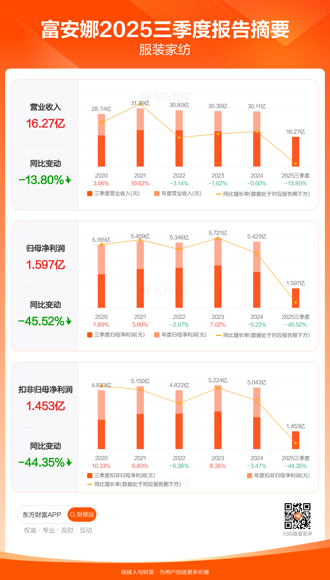 富安娜10月25日发布2025年三季报显示,公司前三季实现营业收入16.27亿元,同比下滑13.80%;归母净利润1.60亿元,同比下滑45.52%;扣非归母净利润1.45亿元,同比下滑44.35%。