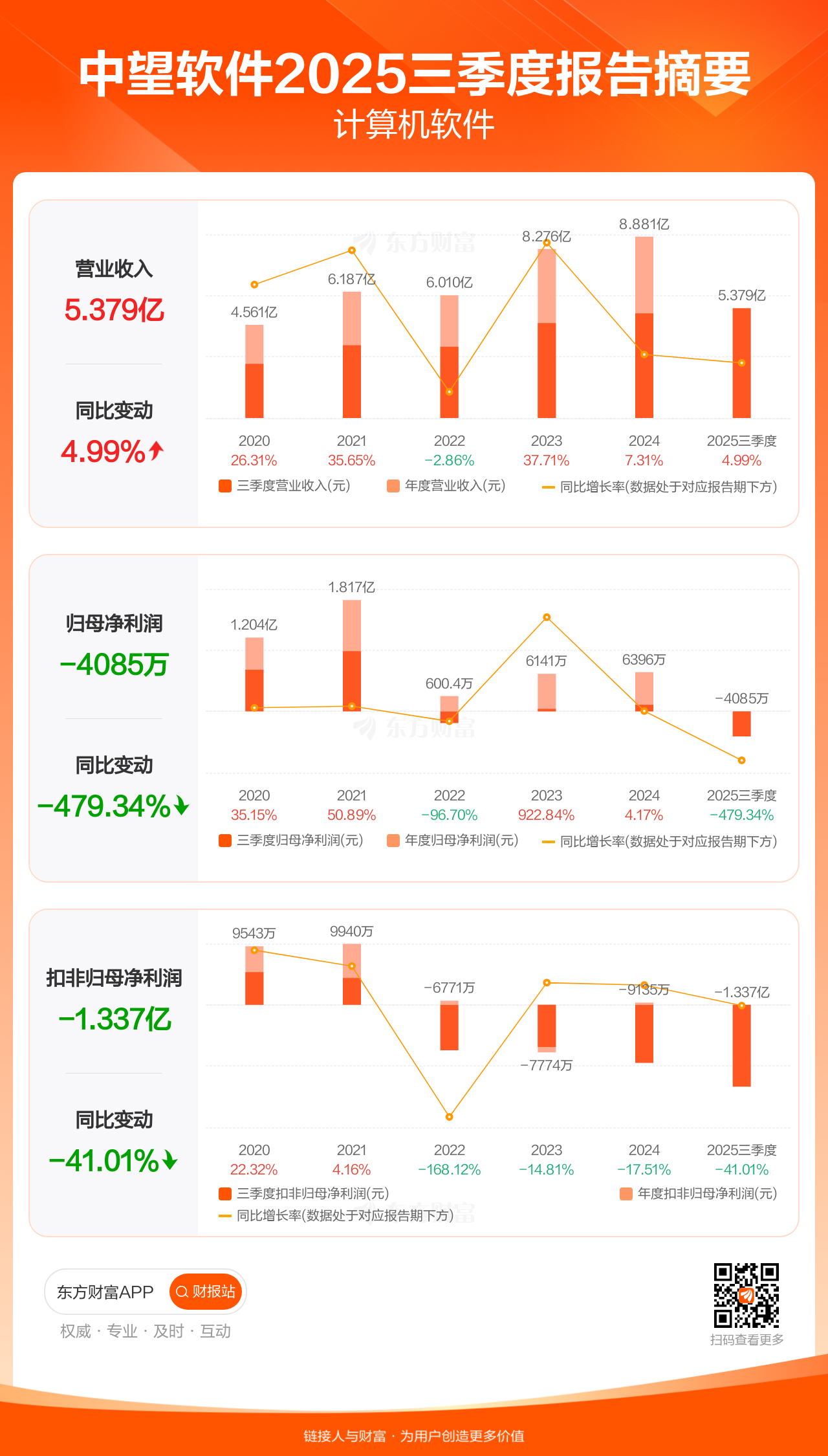 中望软件10月25日发布2025年三季报显示,公司前三季实现营业收入5.38亿元,同比增长4.99%;归母净利润-4084.87万元;扣非归母净利润-1.34亿元。