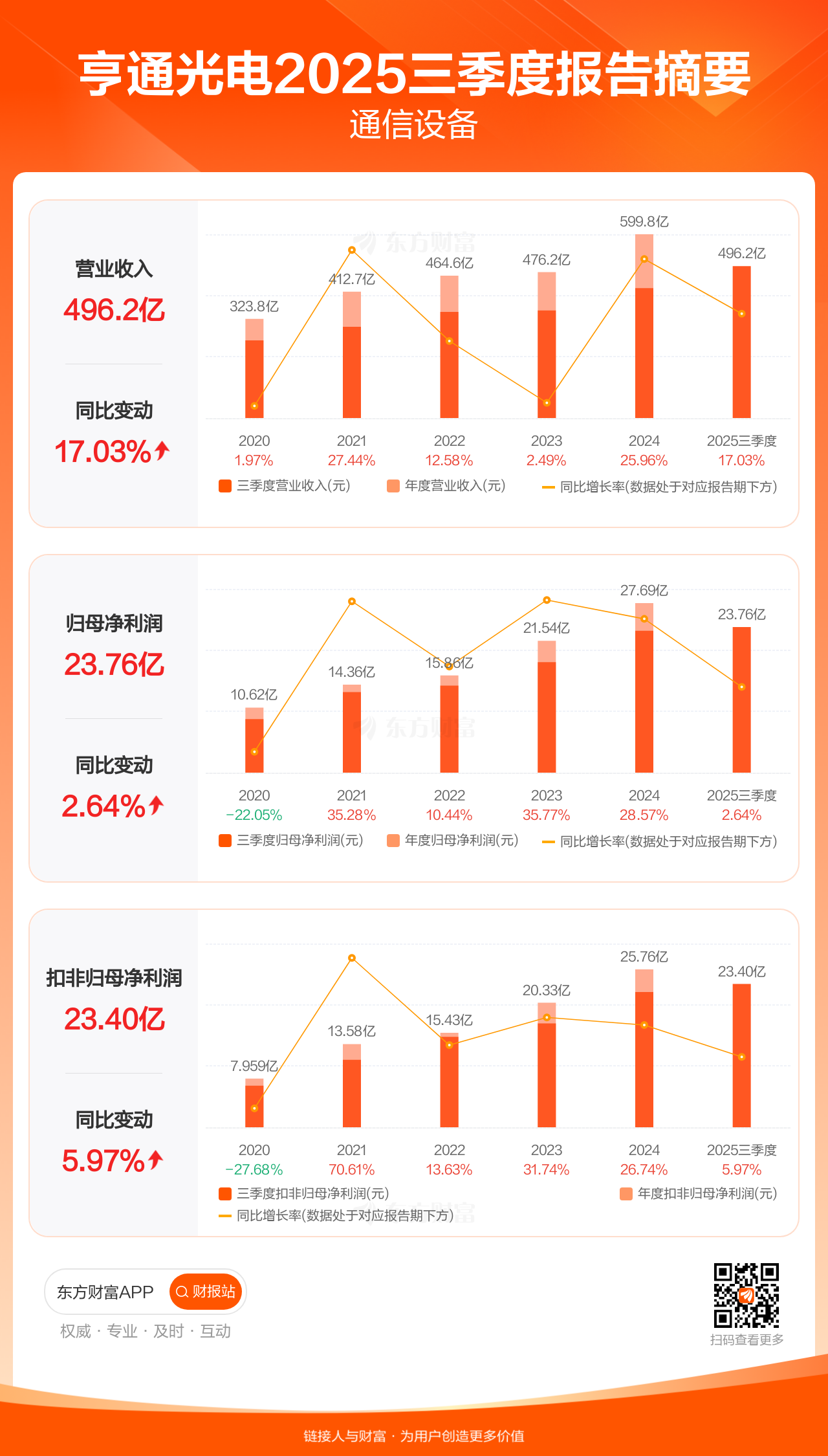 亨通光电10月28日发布2025年三季报显示,公司前三季实现营业收入496.21亿元,同比增长17.03%;归母净利润23.76亿元,同比增长2.64%;扣非归母净利润23.40亿元,同比增长5.97%。
