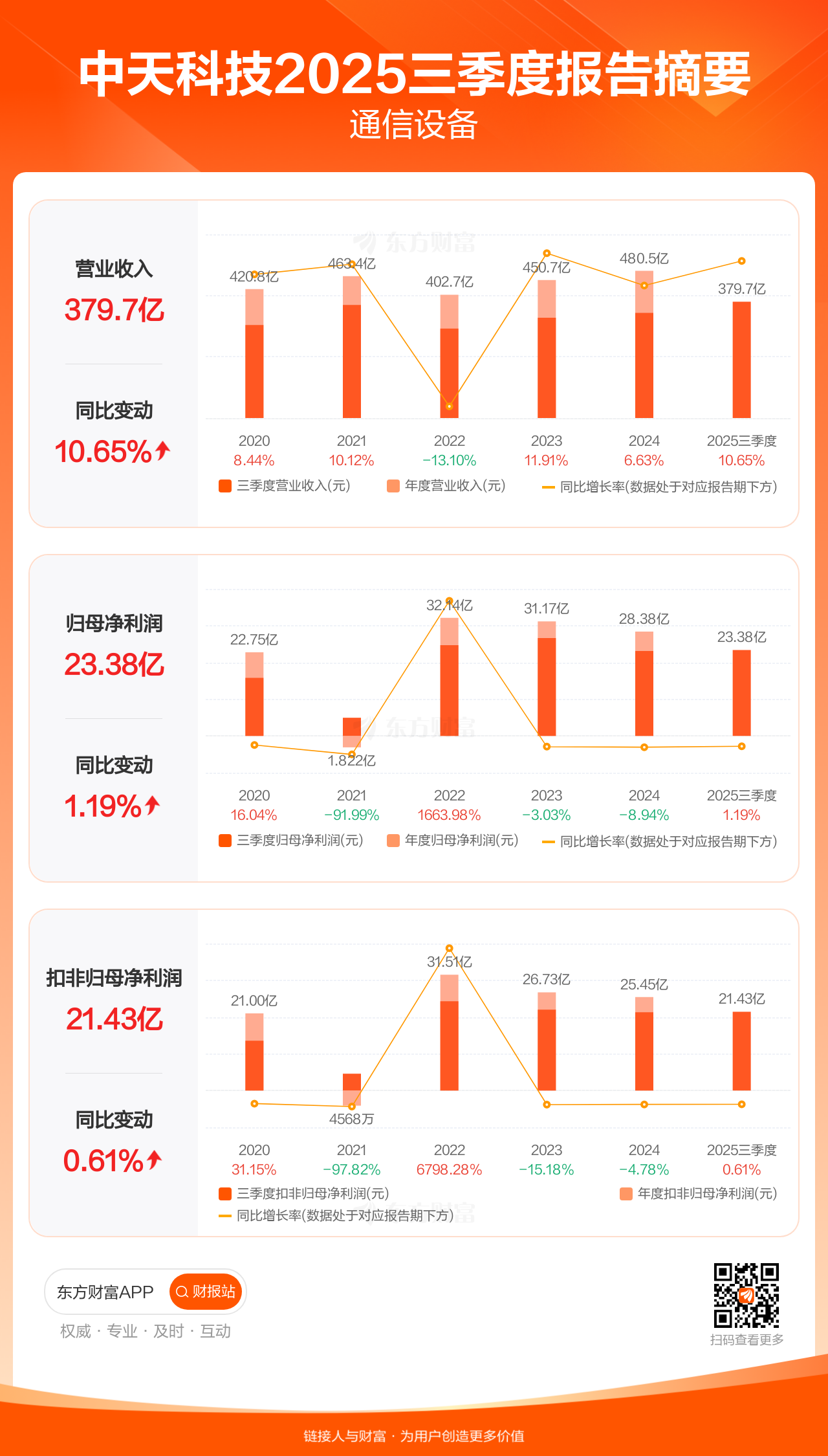 中天科技10月28日发布2025年三季报显示,公司前三季实现营业收入379.74亿元,同比增长10.65%;归母净利润23.38亿元,同比增长1.19%;扣非归母净利润21.43亿元,同比增长0.61%。