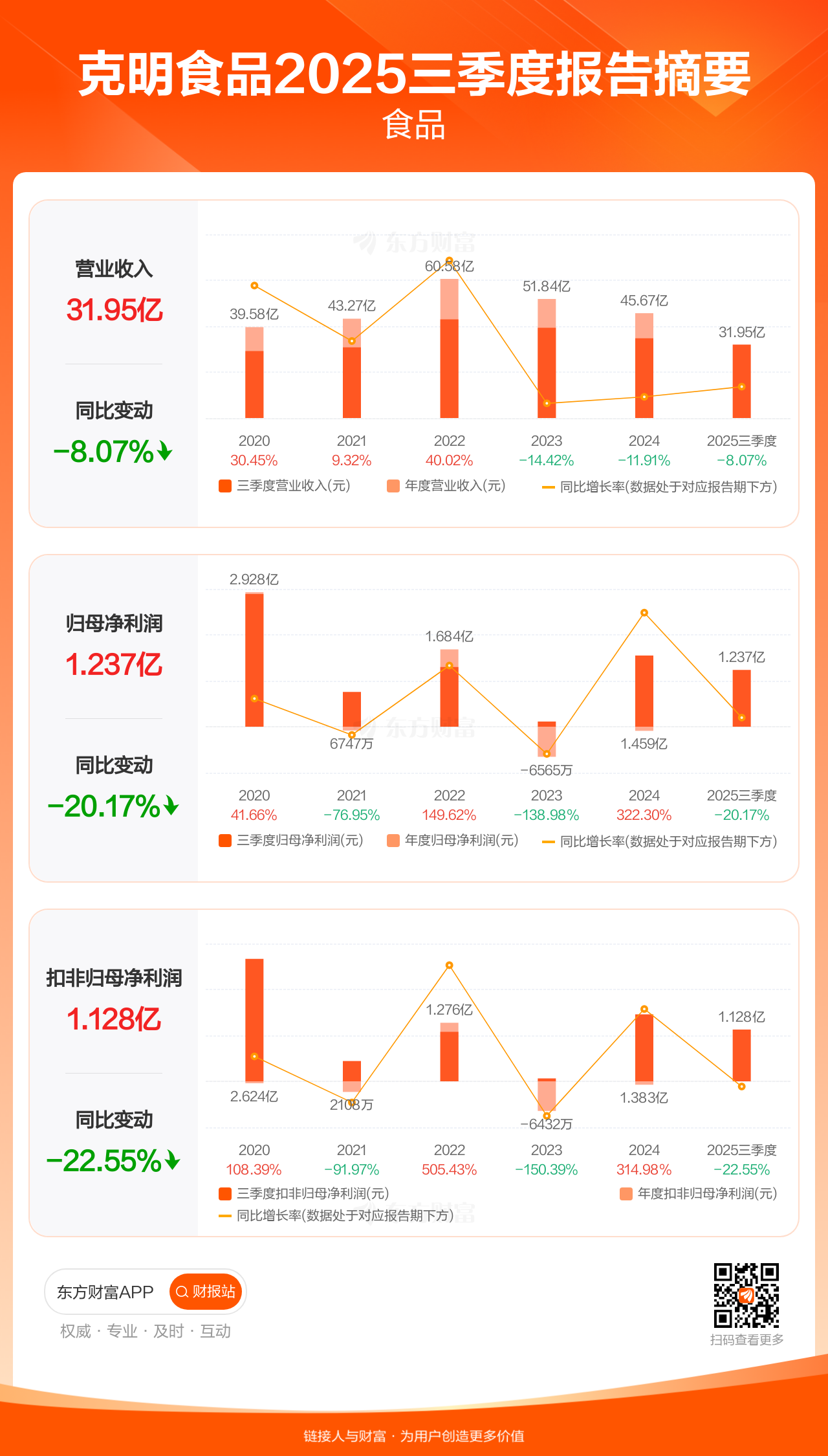 克明食品10月29日发布2025年三季报显示,公司前三季实现营业收入31.95亿元,同比下滑8.07%;归母净利润1.24亿元,同比下滑20.17%;扣非归母净利润1.13亿元,同比下滑22.55%。