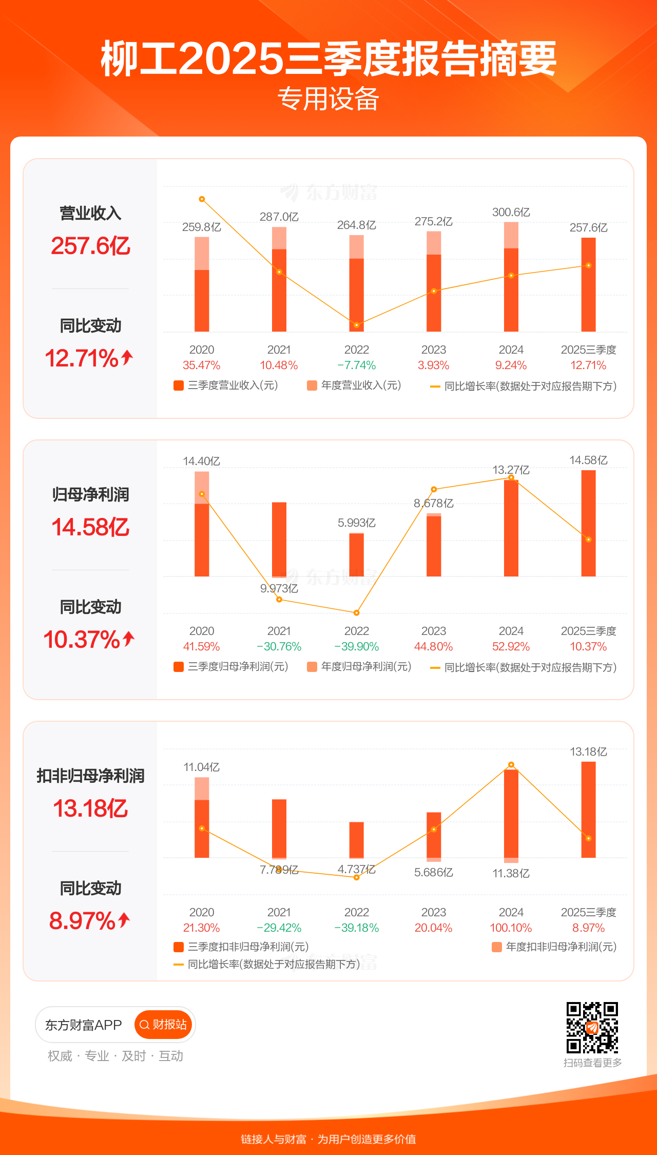 柳工10月25日发布2025年三季报显示,公司前三季实现营业收入257.60亿元,同比增长12.71%;归母净利润14.58亿元,同比增长10.37%;扣非归母净利润13.18亿元,同比增长8.97%。