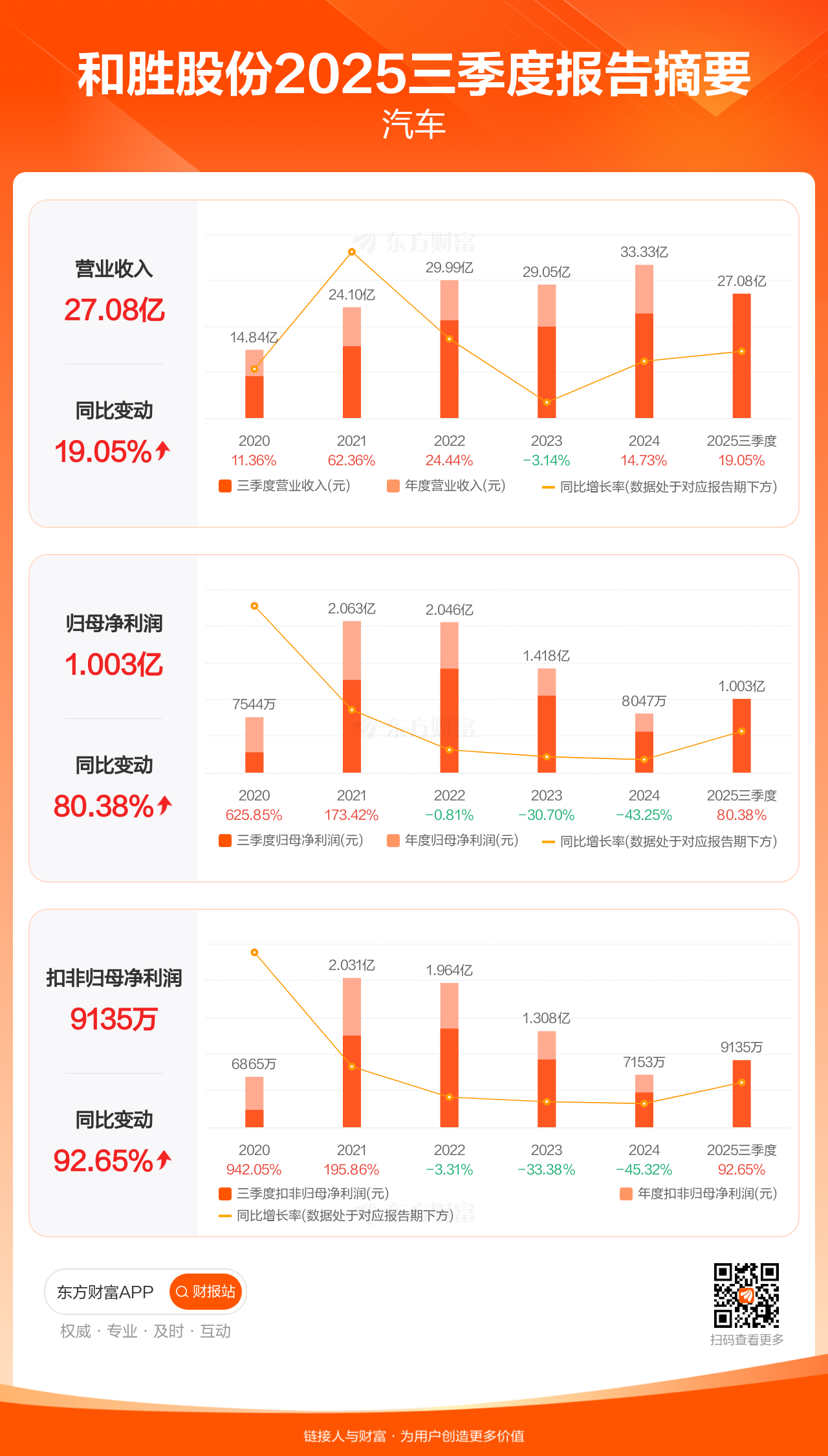 和胜股份10月29日发布2025年三季报显示,公司前三季实现营业收入27.08亿元,同比增长19.05%;归母净利润1.00亿元,同比增长80.38%;扣非归母净利润9135.18万元,同比增长92.65%。