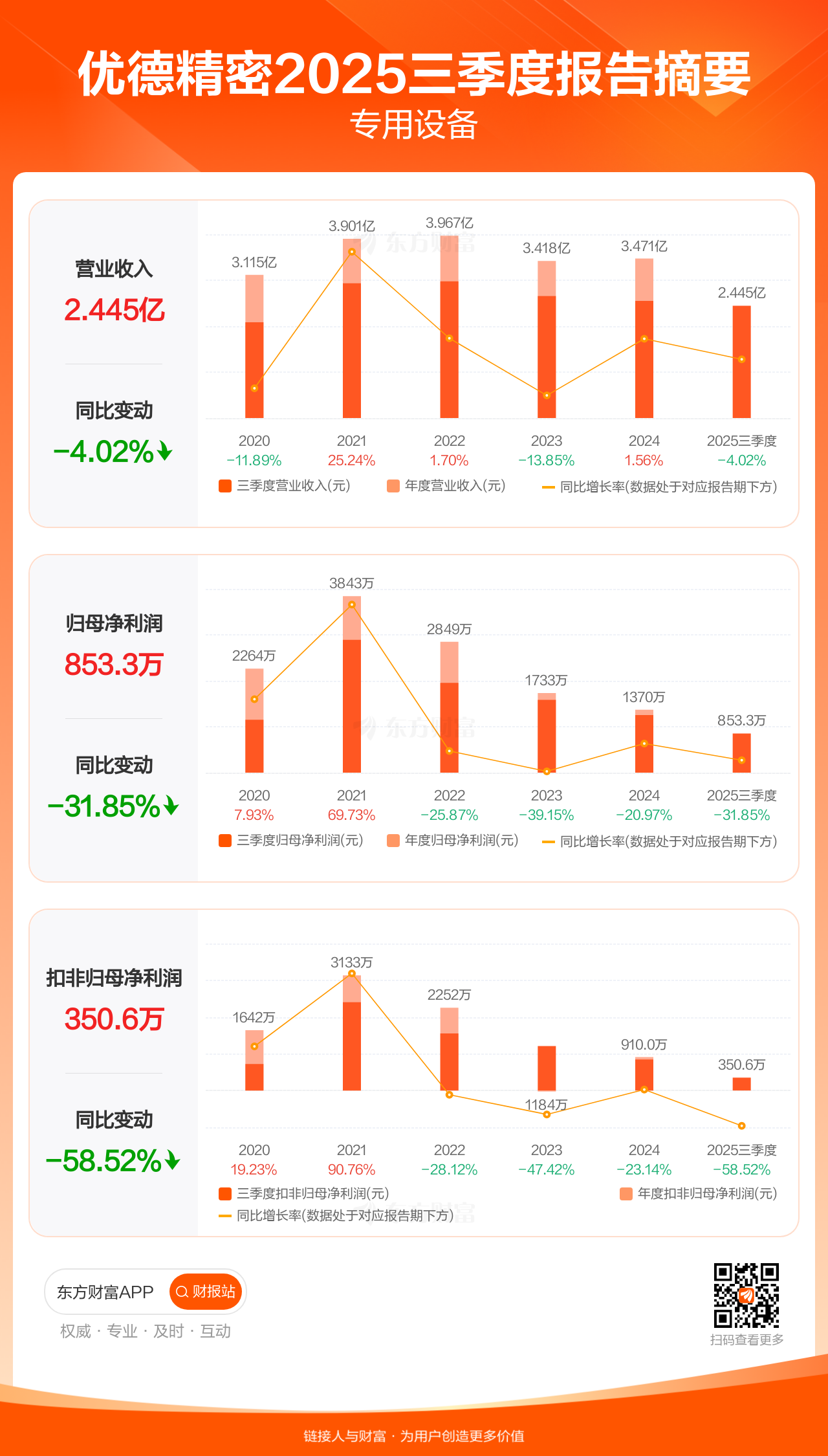 优德精密10月29日发布2025年三季报显示,公司前三季实现营业收入2.45亿元,同比下滑4.02%;归母净利润853.29万元,同比下滑31.85%;扣非归母净利润350.56万元,同比下滑58.52%。