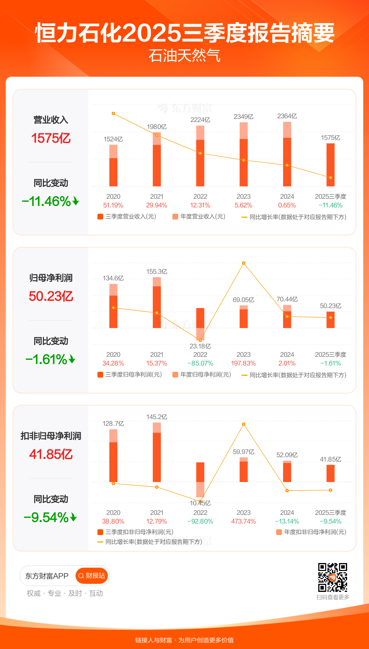 恒力石化10月28日发布2025年三季报显示,公司前三季实现营业收入1574.67亿元,同比下滑11.46%;归母净利润50.23亿元,同比下滑1.61%;扣非归母净利润41.85亿元,同比下滑9.54%。