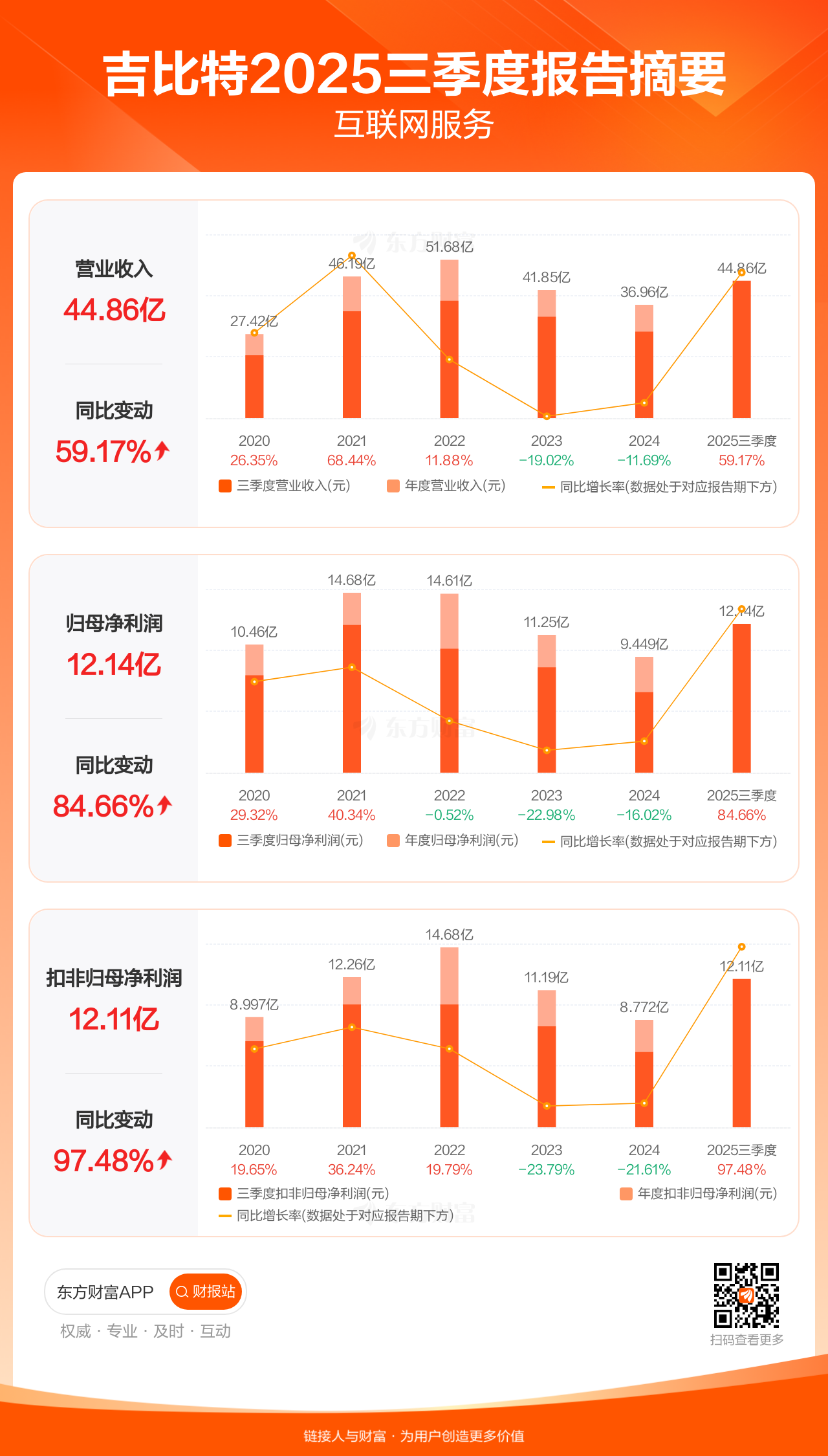 吉比特10月29日发布2025年三季报显示,公司前三季实现营业收入44.86亿元,同比增长59.17%;归母净利润12.14亿元,同比增长84.66%;扣非归母净利润12.11亿元,同比增长97.48%。