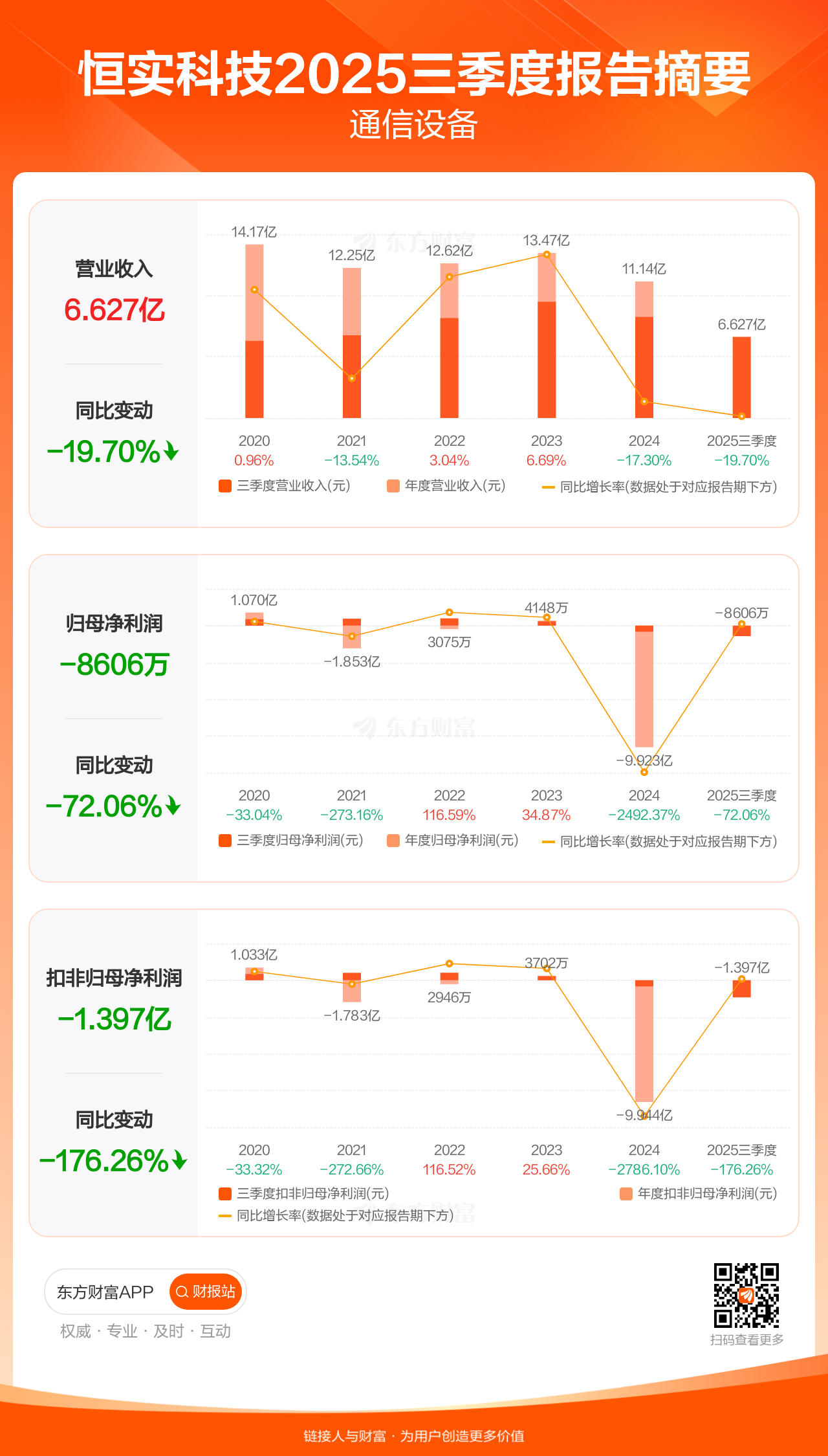恒实科技10月29日发布2025年三季报显示,公司前三季实现营业收入6.63亿元,同比下滑19.70%;归母净利润-8606.02万元;扣非归母净利润-1.40亿元。
