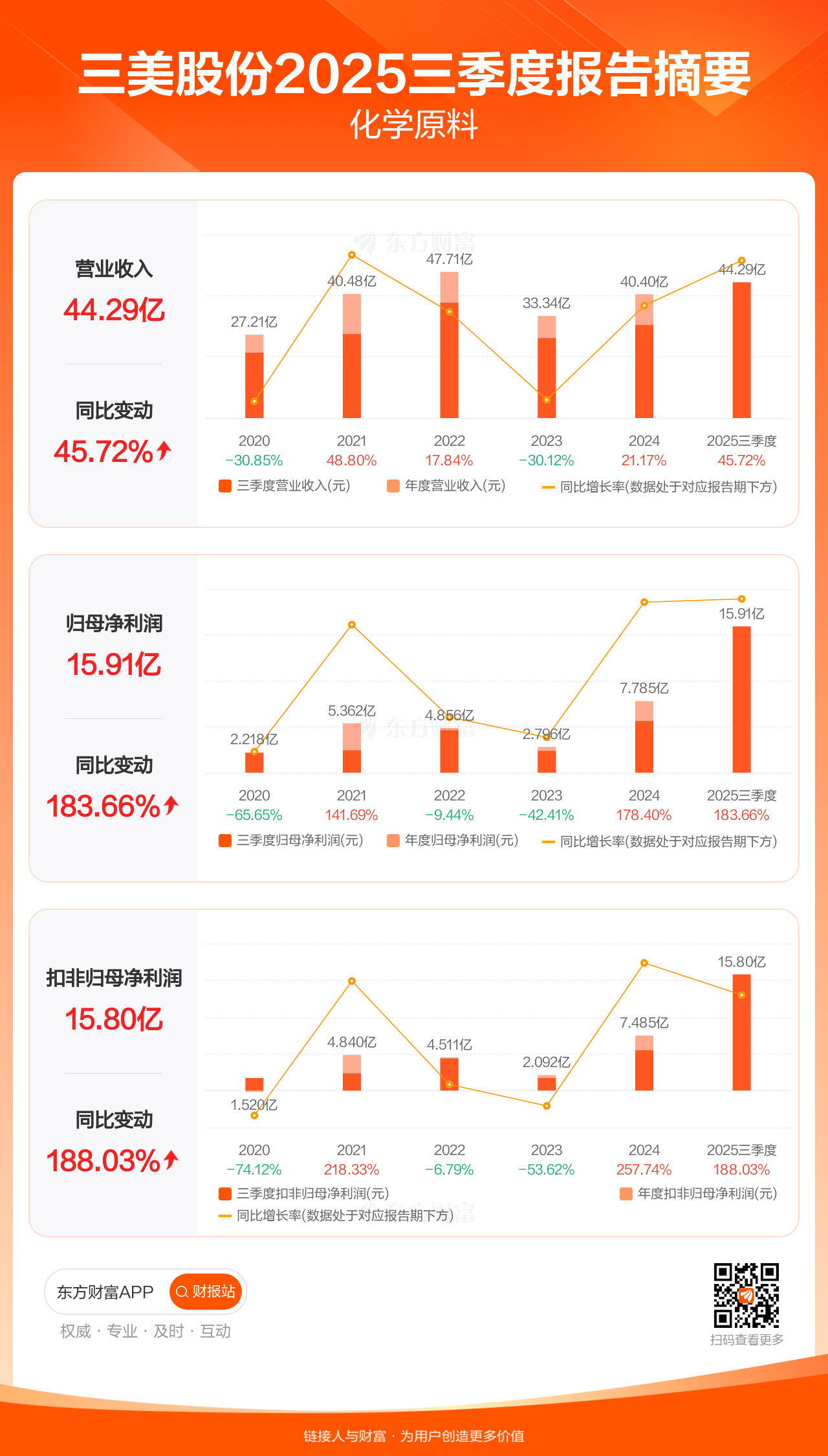 三美股份10月28日发布2025年三季报显示,公司前三季实现营业收入44.29亿元,同比增长45.72%;归母净利润15.91亿元,同比增长183.66%;扣非归母净利润15.80亿元,同比增长188.03%。