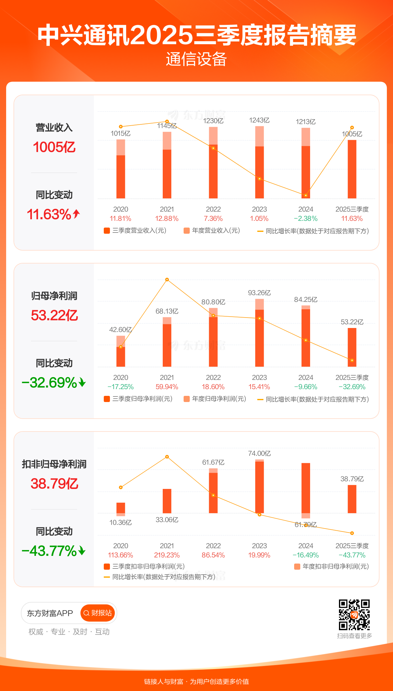 中兴通讯10月29日发布2025年三季报显示,公司前三季实现营业收入1005.20亿元,同比增长11.63%;归母净利润53.22亿元,同比下滑32.69%;扣非归母净利润38.79亿元,同比下滑43.77%。
