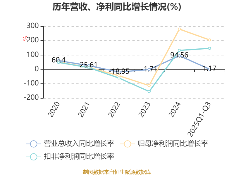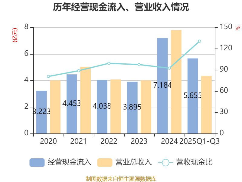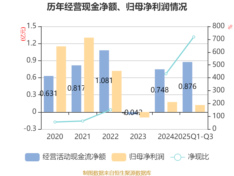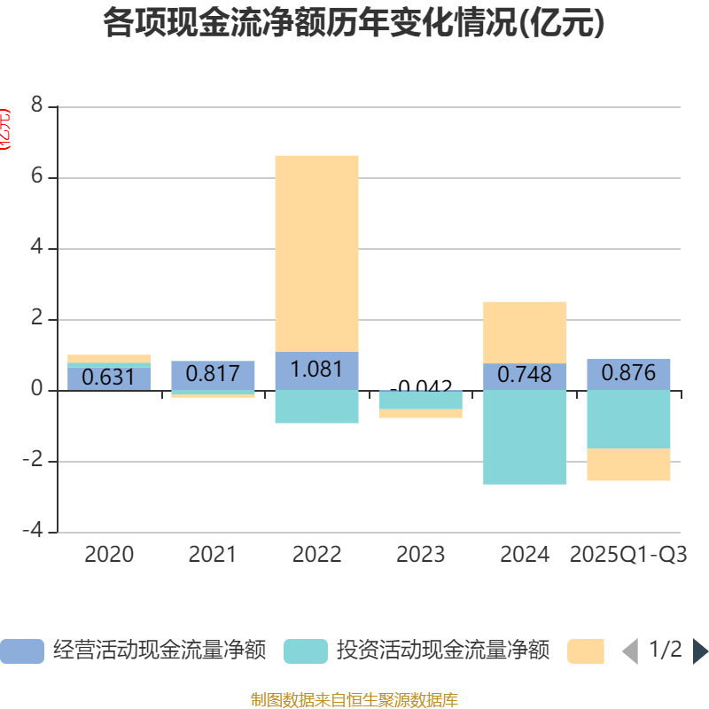 2025年前三季度,公司经营活动现金流净额为8756.19万元,同比增加2.18亿元;筹资活动现金流净额-9024.5万元,同比减少2.46亿元;投资活动现金流净额-1.66亿元,上年同期为-1.46亿元。