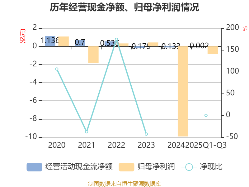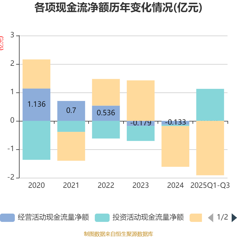 2025年前三季度,公司经营活动现金流净额为15.41万元,同比增加2.26亿元;筹资活动现金流净额-1.91亿元,同比减少1.04亿元;投资活动现金流净额1.12亿元,上年同期为32.86万元。
