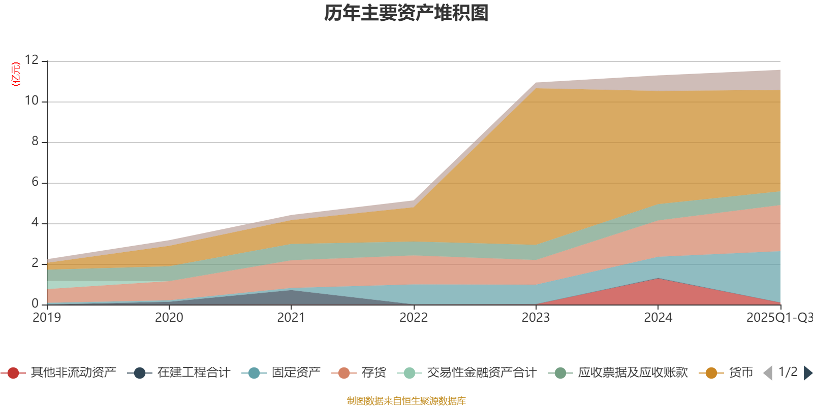 资产重大变化方面,截至2025年三季度末,公司固定资产较上年末增加142.89%,占公司总资产比重上升12.69个百分点;其他非流动资产较上年末减少92.85%,占公司总资产比重下降10.52个百分点;货币资金较上年末减少10.55%,占公司总资产比重下降6.27个百分点;存货较上年末增加26.61%,占公司总资产比重上升3.76个百分点。