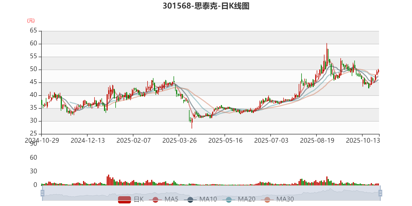 以10月28日收盘价计算,思泰克目前市盈率(TTM)约为49.97倍,市净率(LF)约5.09倍,市销率(TTM)约11.56倍。