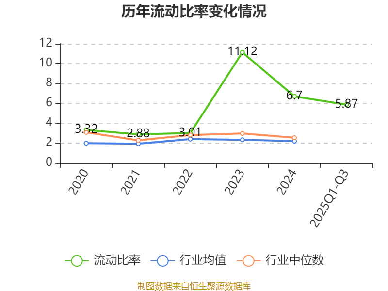 2025年前三季度,公司流动比率为5.87,速动比率为4.3。