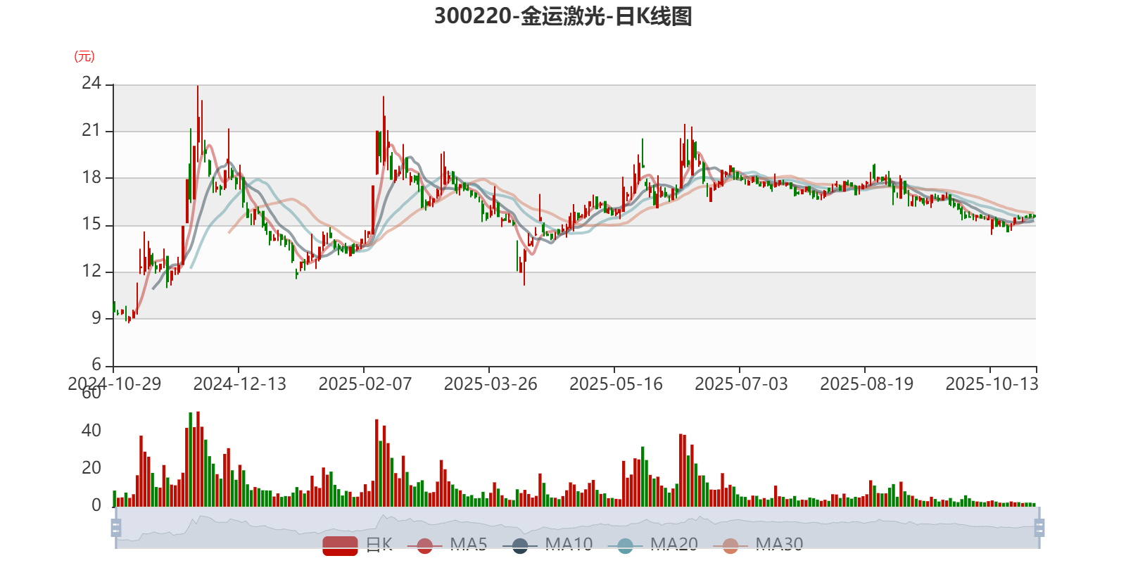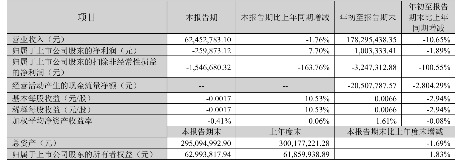 中证智能财讯金运激光(300220)10月29日披露2025年第三季度报告。前三季度公司实现营业总收入1.78亿元,同比下降10.65%;归母净利润100.33万元,同比下降1.89%;扣非净利润亏损324.73万元,上年同期亏损161.92万元;经营活动产生的现金流量净额为-2050.78万元,上年同期为-70.61万元;报告期内,金运激光基本每股收益为0.0066元,加权平均净资产收益率为1.61%。