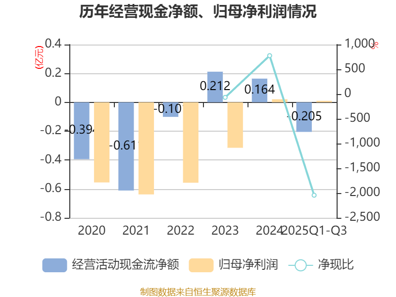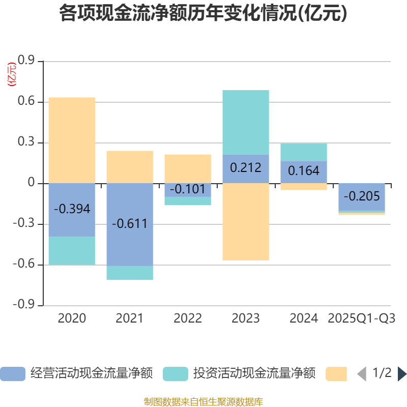 2025年前三季度,公司经营活动现金流净额为-2050.78万元,同比减少1980.17万元;筹资活动现金流净额-153.91万元,同比增加327.86万元;投资活动现金流净额-140.9万元,上年同期为1420.03万元。