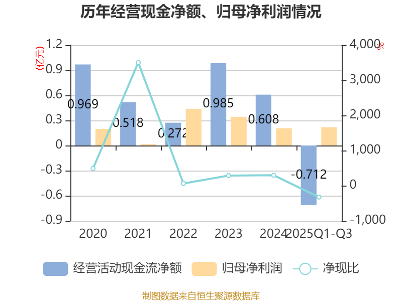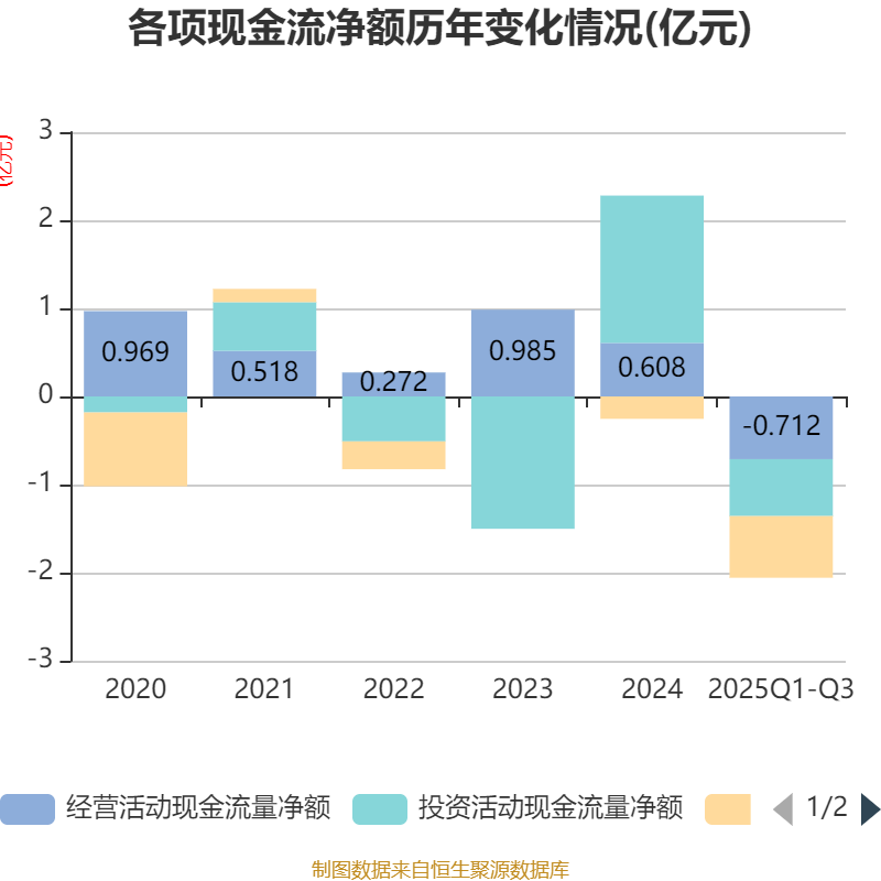 2025年前三季度,公司经营活动现金流净额为-7122.72万元,同比减少8951.9万元;筹资活动现金流净额-6999.57万元,同比减少4459.46万元;投资活动现金流净额-6457.85万元,上年同期为9049.36万元。
