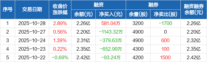 融资方面,当日融资买入2370.77万元,融资偿还1789.73万元,融资净买入581.04万元。融券方面,融券卖出700股,融券偿还2400股,融券余量3200股,融券余额10.6万元。融资融券余额合计2.26亿元。