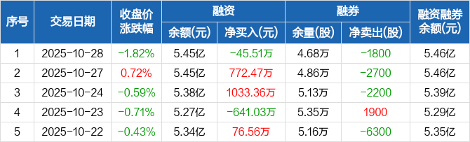 融资方面,当日融资买入4783.74万元,融资偿还4829.25万元,融资净偿还45.51万元。融券方面,融券卖出1100股,融券偿还2900股,融券余量4.68万股,融券余额116.3万元。融资融券余额合计5.46亿元。