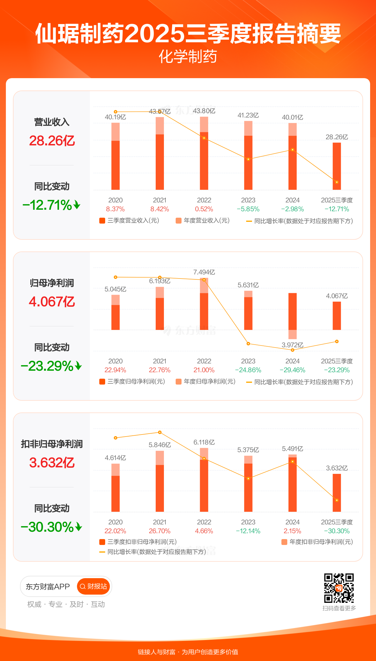 仙琚制药10月28日发布2025年三季报显示,公司前三季实现营业收入28.26亿元,同比下滑12.71%;归母净利润4.07亿元,同比下滑23.29%;扣非归母净利润3.63亿元,同比下滑30.30%。